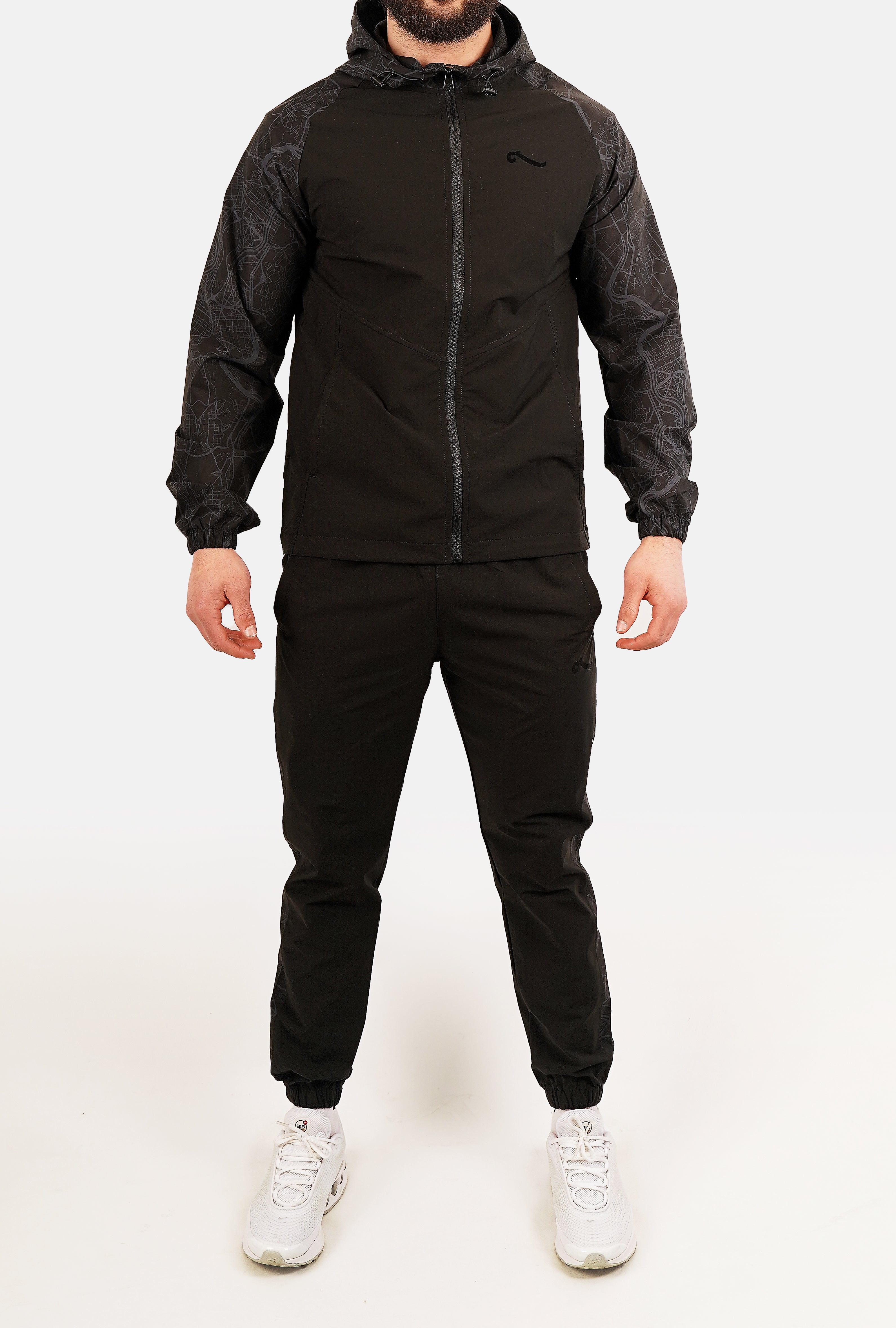 Survêtement Dark Knight en polyester 100%, conçu pour affirmer votre style urbain. Motifs graphiques intégrés le long de la veste et du pantalon pour une cohérence visuelle affirmée. Coupe moderne présentée sur mannequin taille M. Matière durable et facile d'entretien, idéale pour le streetwear quotidien ou les sessions de détente. Finitions premium et design intemporel qui traverse les saisons.